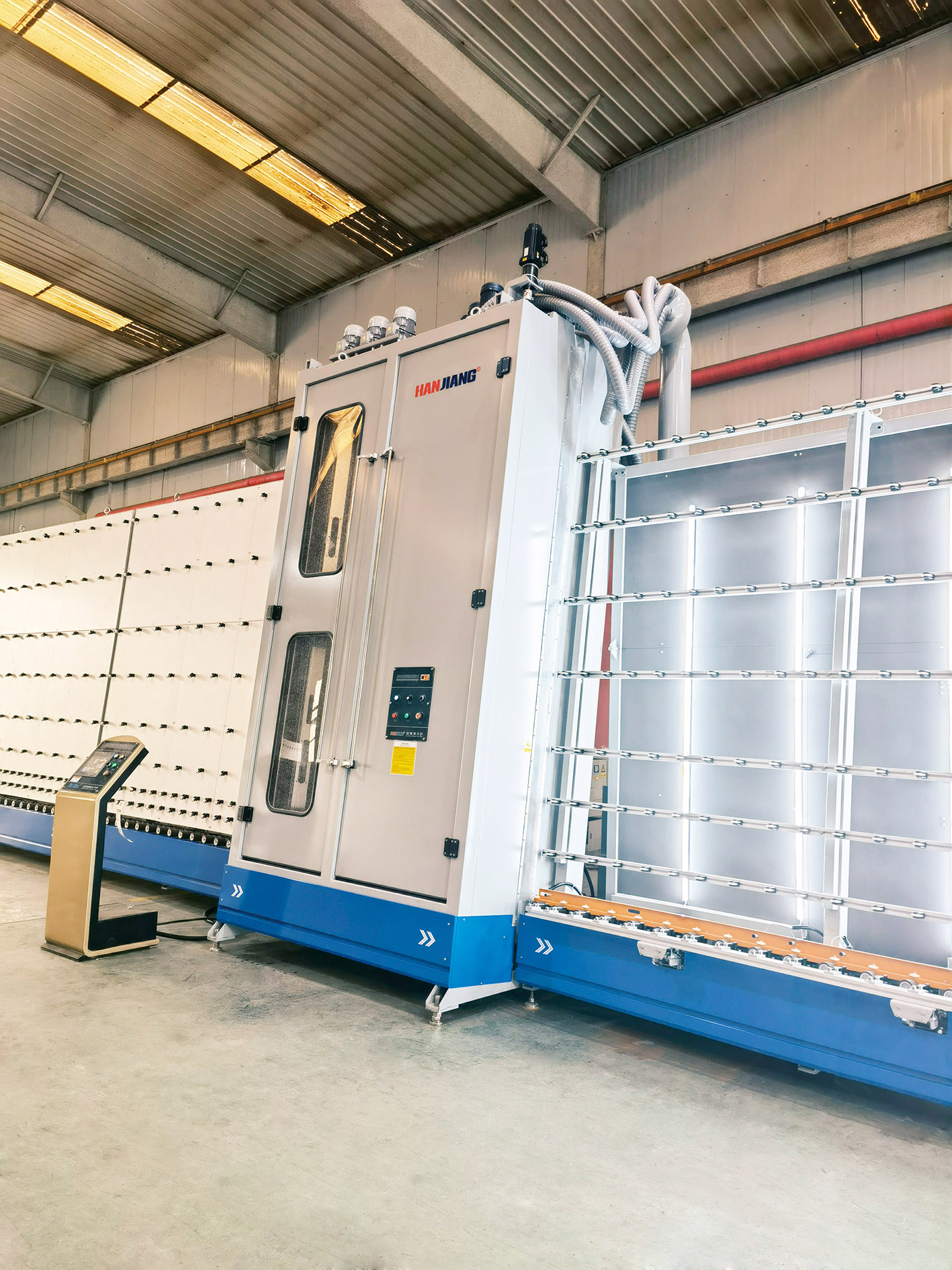 隨著當(dāng)前市場(chǎng)和社會(huì)發(fā)展,各類品牌店、4S店、展示廳等公共項(xiàng)目對(duì)充氣型中空超大玻璃的需求日益劇增。 2021年韓江公司受國(guó)內(nèi)一家知名企業(yè)委托,承接定制技術(shù)規(guī)格為:3300mm×9000mm Low-E玻璃除膜機(jī)和中空玻璃充氣生產(chǎn)線,加工單片玻璃厚度50mm,中空玻璃厚度120mm,在線充氬氣含量達(dá)到90%以上。