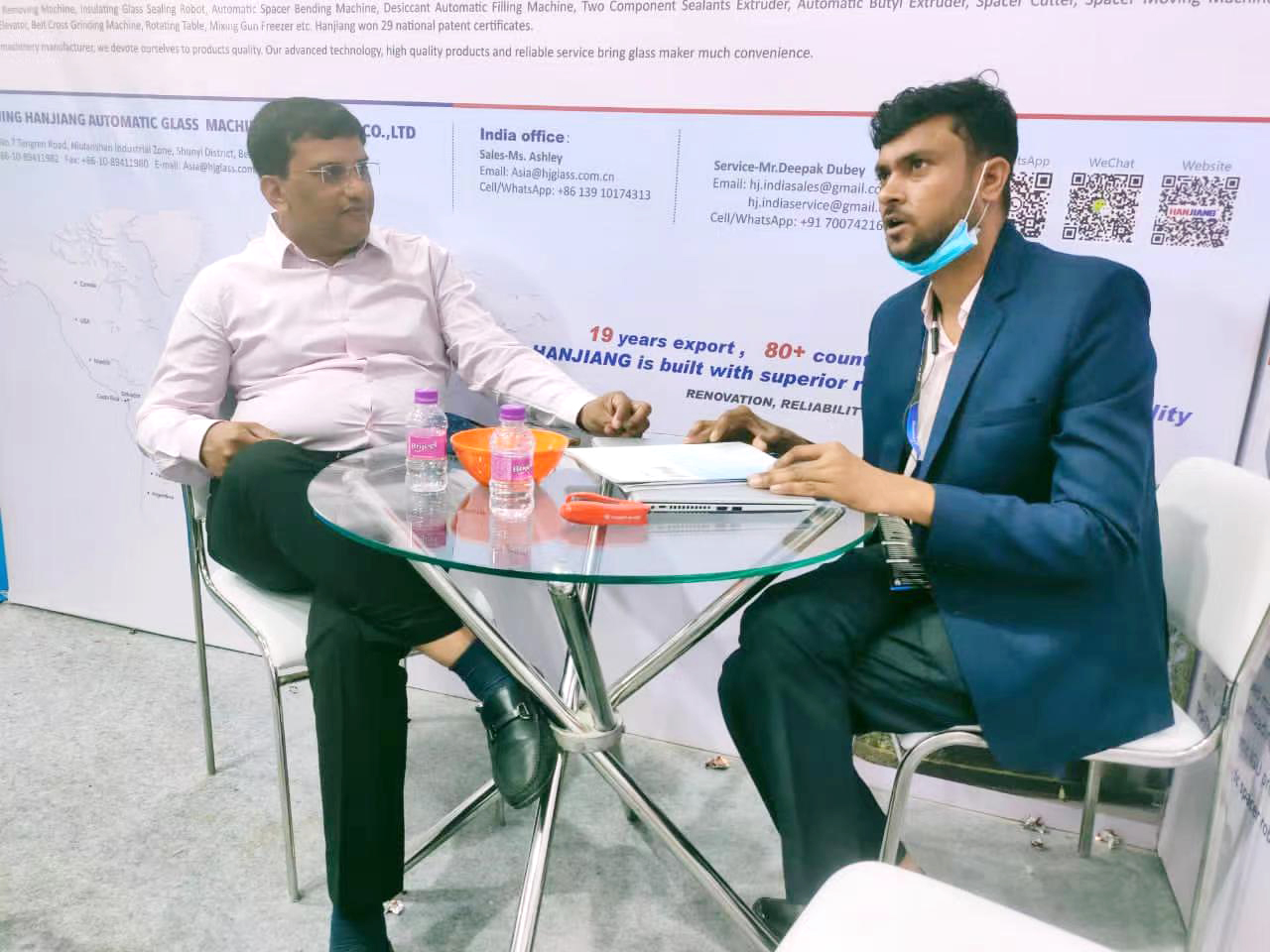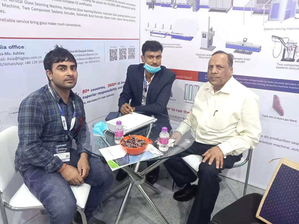 2. 全自動化中空線的全面技術(shù)講解:雖然該配置在印度市場還很“新”,但我司致力于將最先進的技術(shù)帶領(lǐng)到世界各地,在展會上給當?shù)氐牟A罴庸S介紹未來的中空玻璃生產(chǎn)方向。此次,韓江也結(jié)合最新研發(fā)的工業(yè)4.0 之云系列數(shù)據(jù)管家系統(tǒng),引領(lǐng)客戶去思考如何巧妙地將傳統(tǒng)型企業(yè)轉(zhuǎn)型為現(xiàn)代化及數(shù)字化工廠。 該主題也在展會現(xiàn)場帶來了熱議,當?shù)乜蛻艏娂姳硎?,韓江的數(shù)據(jù)系統(tǒng)給他們對中空生產(chǎn)一個全新的認知,越是有經(jīng)驗的玻璃深加工客戶越是急于打破傳統(tǒng)的管理模式,對數(shù)據(jù)共享,預(yù)測維保,優(yōu)化排產(chǎn)能提出了一系列的可行性方案。
