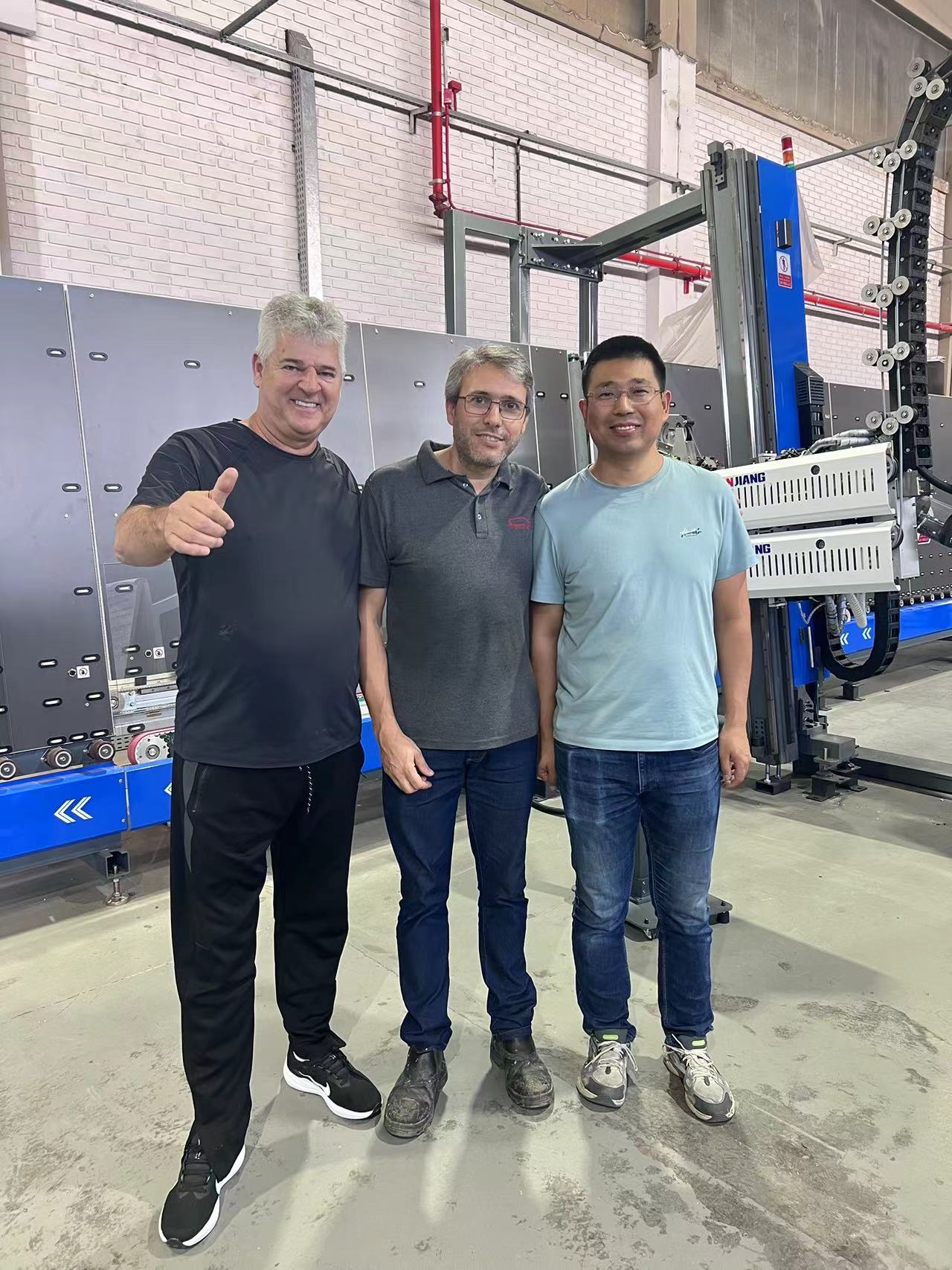 However, realizing this process was with many challenges. Synchronizing the cycle time of every component in a fully automated production line—from loading to unloading, washing to frame assembly, robotic handling of Super Spacer to high-speed Argon gas-filling and pressing, and high-speed sealing—required meticulous planning. Starting with strict calculations during the design phase, followed by production, commissioning, trial runs, and final acceptance, we encountered numerous issues. These ranged from automating the glass loading process and handling different glass rack heights for customers, to preventing glass adhesion during unmanned operations, matching the number of glass racks during loading and unloading, accelerating the robotic arm's speed under full load, and synchronizing the entire line’s speed. Each challenge was overcome through the tireless collaboration of the HANJIANG team and our Brazilian service team-NEX, who worked day and night.
